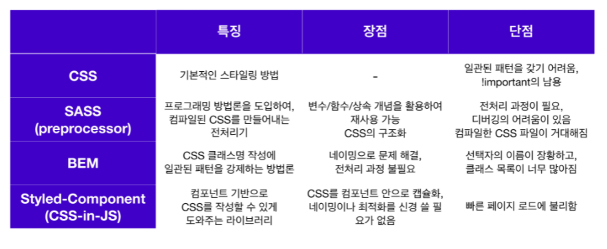 css나 sass같이 class, id, tag name을 가져와서 쓰지 않고, 별도의 스타일 컴포넌트를 생성하여 태그에 쓰는 것을 말합니다. 스타일 컴포넌트는 ui단위를 나누어 컴포넌트화 하기때문에 재사용이 가능하며 props로 속성까지 전달하여 조건을 붙일수 있어 여러모로 다양한 이점이 있습니다.