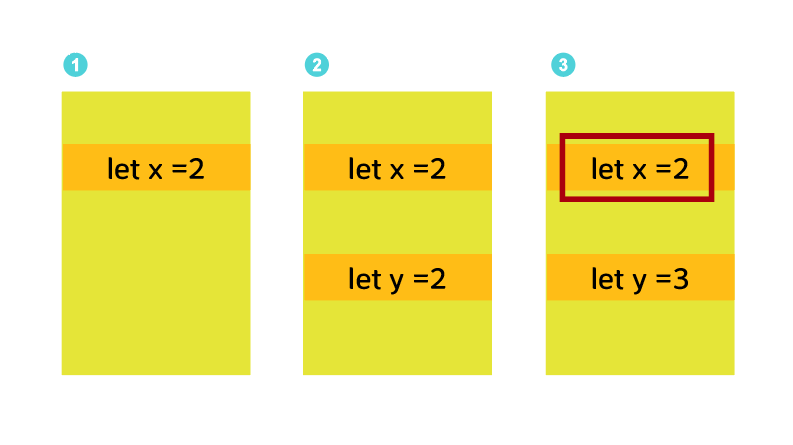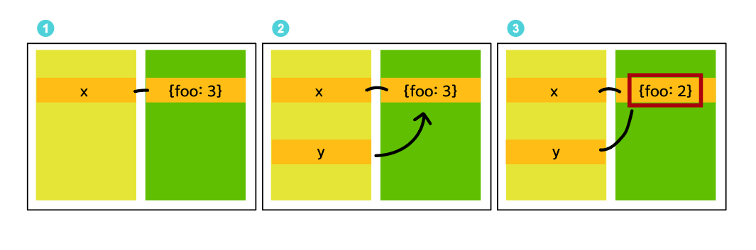 3번줄에 y.foo = 2를 할당하여 값은 {foo:3}으로 변경 되었고 같은 곳을 바라보고 있던 x.foo도 2가 됩니다.