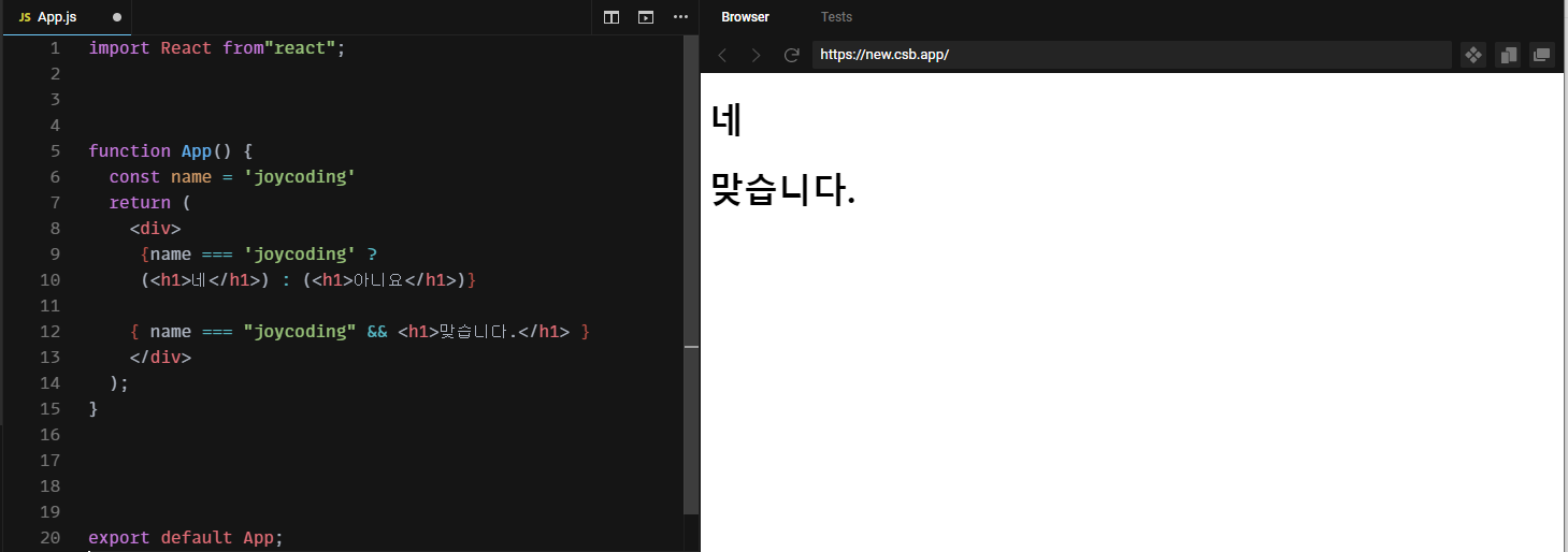 AND연산자는 전자가 true면 후자를 반환하고 false면 전자를 반환시킵니다. 아래 코드 12번줄은 true 여서 후자가 반환되어 맞습니다가 출력됩니다.