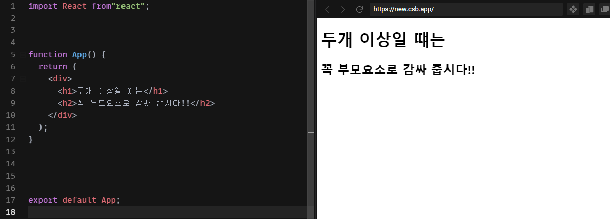 컴포넌트에 여러 요소들이 있다면 이 요소들은 무조건 부모 요소 하나로 감싸야 합니다. (하나일땐 상관없음)