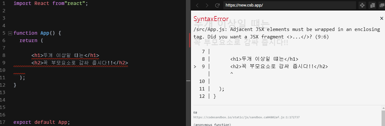 만약 이런식으로 감싸진 요소가 없이 출력한다면 오류가 발생합니다.