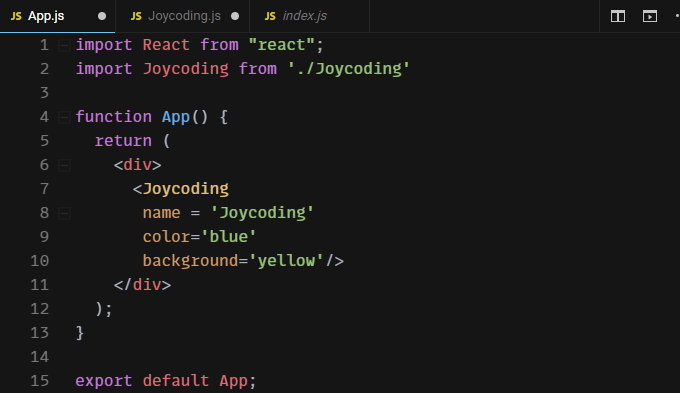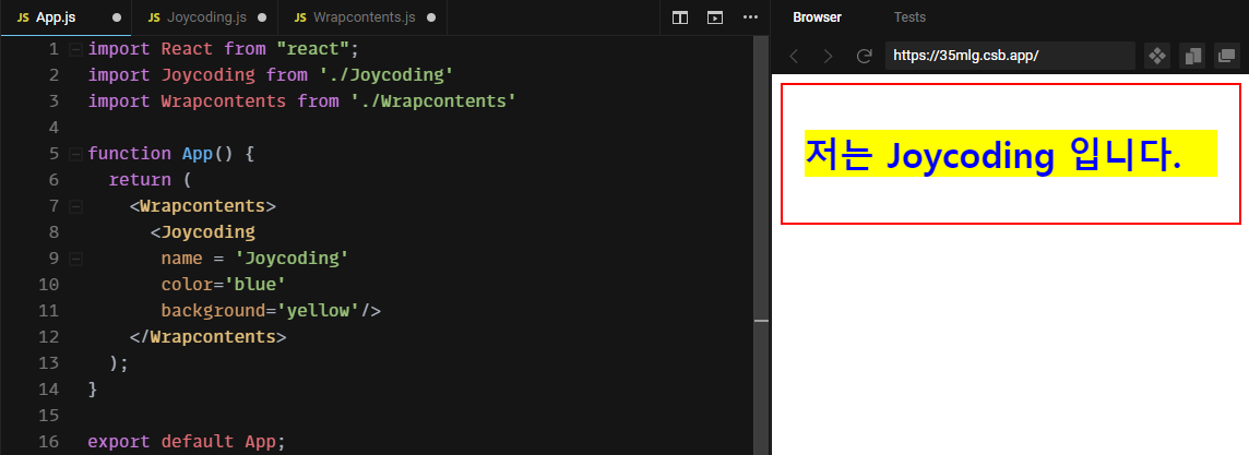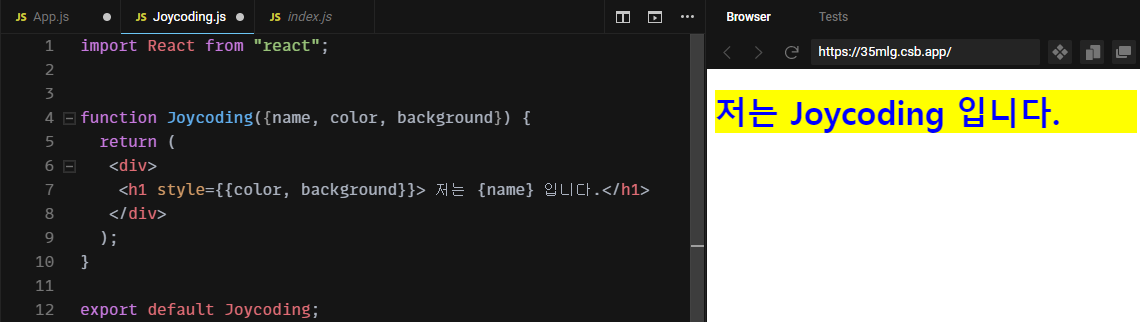 객체 형식으로 가져올 props를 넣어주면 됩니다. 주의 할점은 스타일은 중괄호를{ } 하나 더 써줘야 됩니다! 추가적으로 배경색을 가져오려면 어떻게 하면 될까요 ? 간다합니다. App컴포넌트에 배경색을 추가하고 Joycoding 컴포넌트에 위 와같이 배경만 추가하면 됩니다.