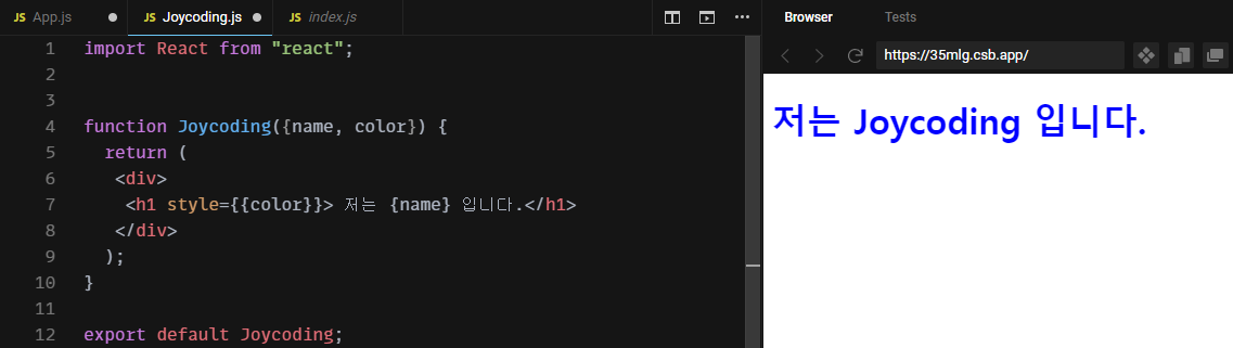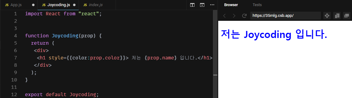 Joycoding 컴포넌트에 다른 props를 전달하기 위해 color 라는 값을 성정해 보겠습니다.