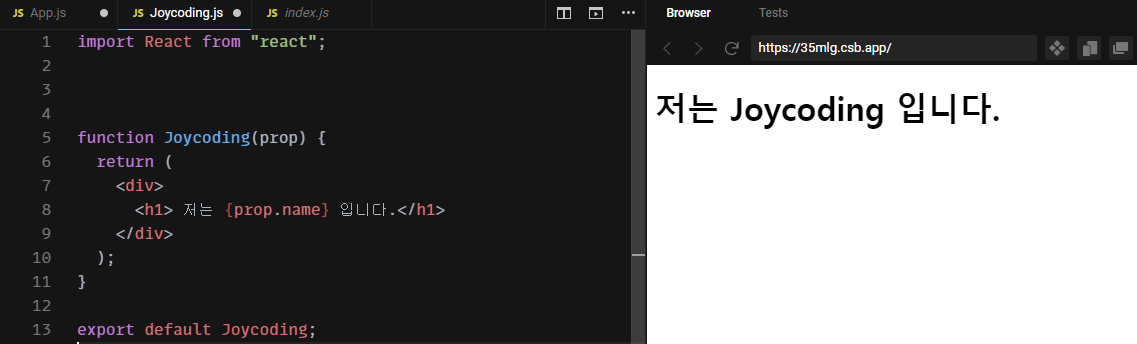 이때 Joycoding 컴포넌트에서 name의 값을 쓰려면 어떻게 쓰면 될까요 ? 아래 코드를 봅시다