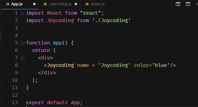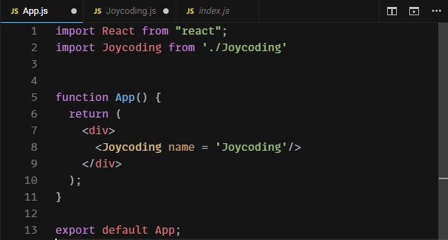 예를 들어 App 컴포넌트에 Joycoding 컴포넌트를 사용 할 때 name 이라는 값을 전달해주고 싶다고 가정해보고 코드를 작성해 봅시다!!