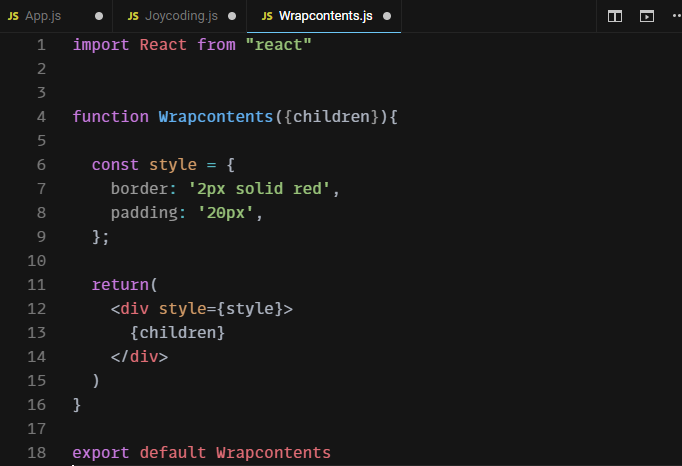 위와 같이 Wrapcontents 컴포넌트를 만들어주고 매개변수(probs)에 객체형태로 children을 넣어줍니다. 또한 랜더링 할 리턴 값에도 같이 넣어 줍시다!